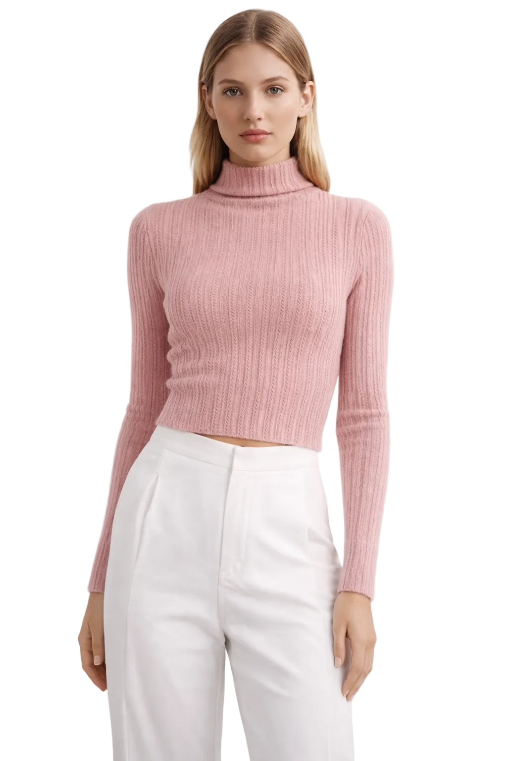 This fitted jumper is crafted in a fine ribbed knit that contours the body for a streamlined silhouette. Designed with a classic roll neck and long sleeves, it features a cropped length that pairs effortlessly with high-waisted trousers or skirts. The soft pink tone adds a subtle pop of colour to everyday styling.