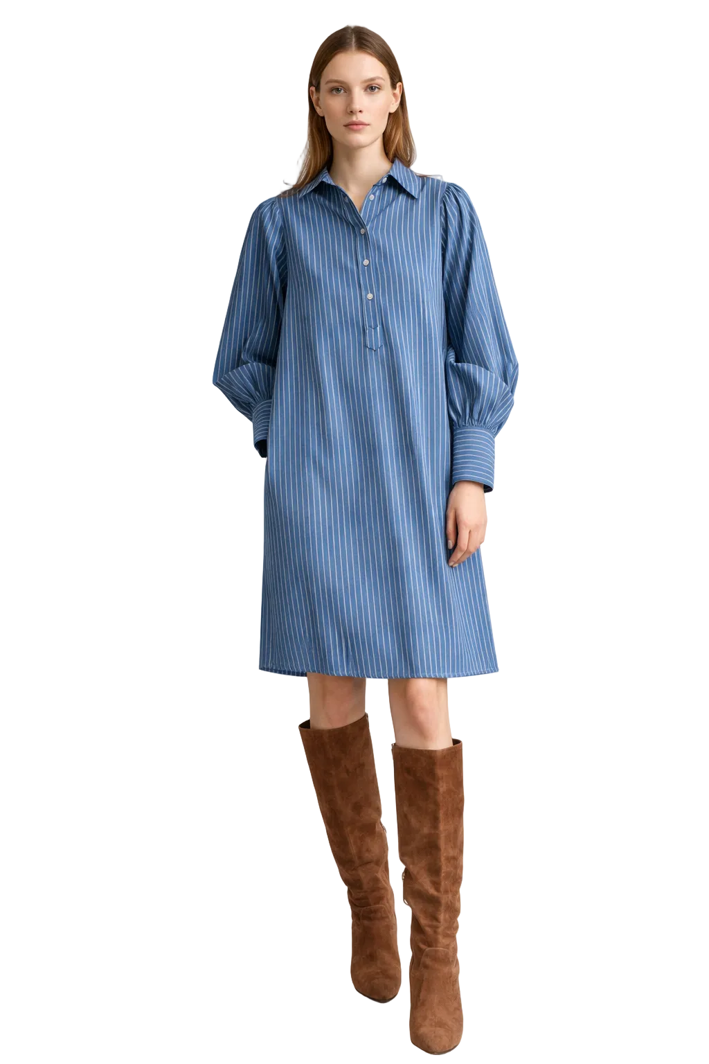 Damska sukienka koszulowa o długości do kolan z pionowym wzorem w paski. Model posiada klasyczny kołnierz, krótkie zapięcie na guziki z przodu oraz długie rękawy zakończone mankietami. Fason jest luźny i prosty.